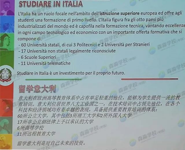 意大利拥有多所世界上最古老的大学、低廉的大学学费。为接待国际学生所做的细致周到的组织工作,两国政府签署了学历互认协议,使得在意大利获得的学历能够在中国得到承认。