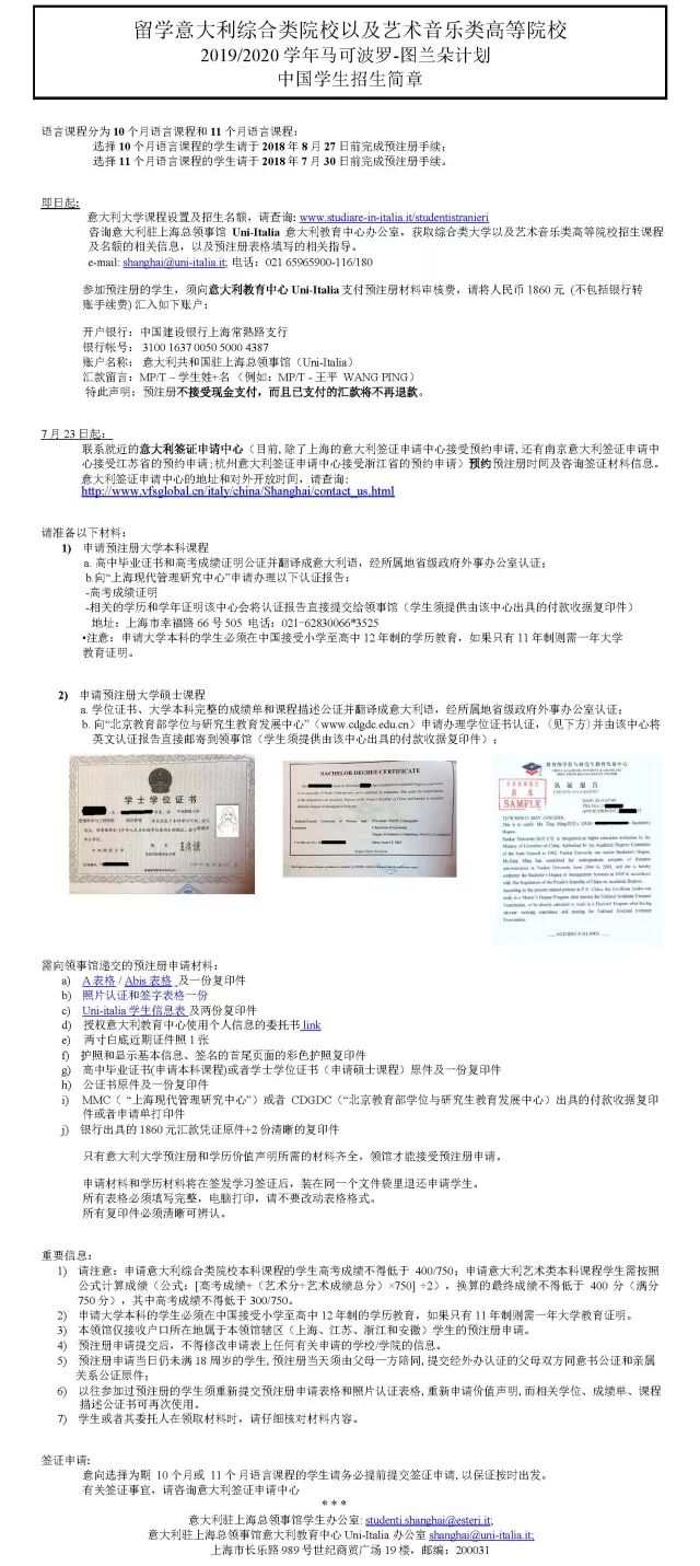 今日,留学意大利综合类院校以及艺术音乐类高等院校2019/2020学年马可波罗-图兰朵计划招生简章已经公布了。选择马可波罗-图兰朵计划的中国学生,你的预注册申请材料准备齐全了吗?查看以下公布的2019/2020学年预注册申请必备材料,现在知道还不晚!