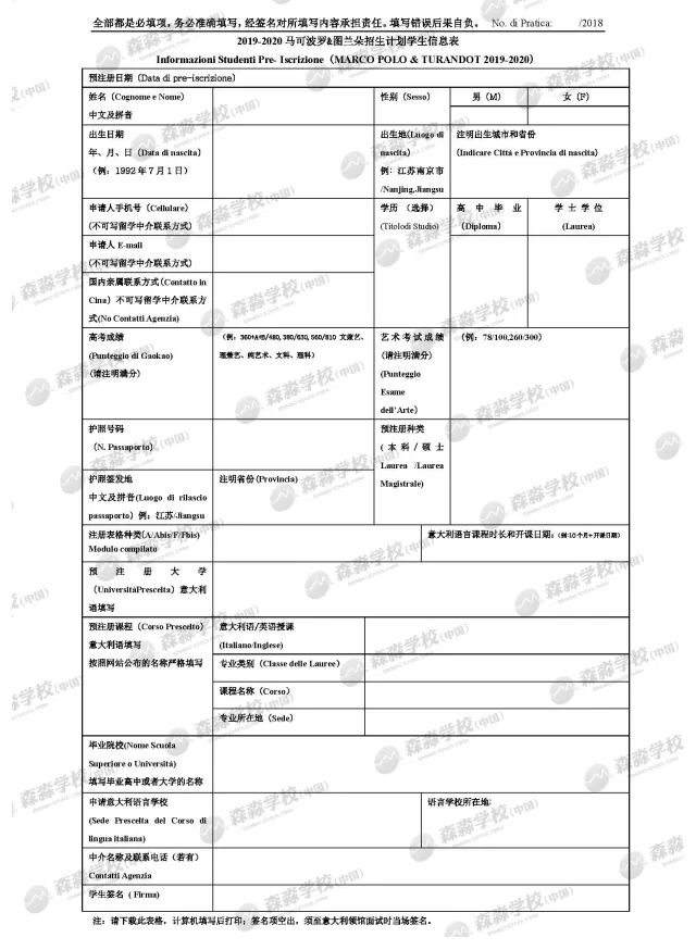 申请2019/2020学年马可波罗-图兰朵计划的学生,需要填写以下预注册申请表格: